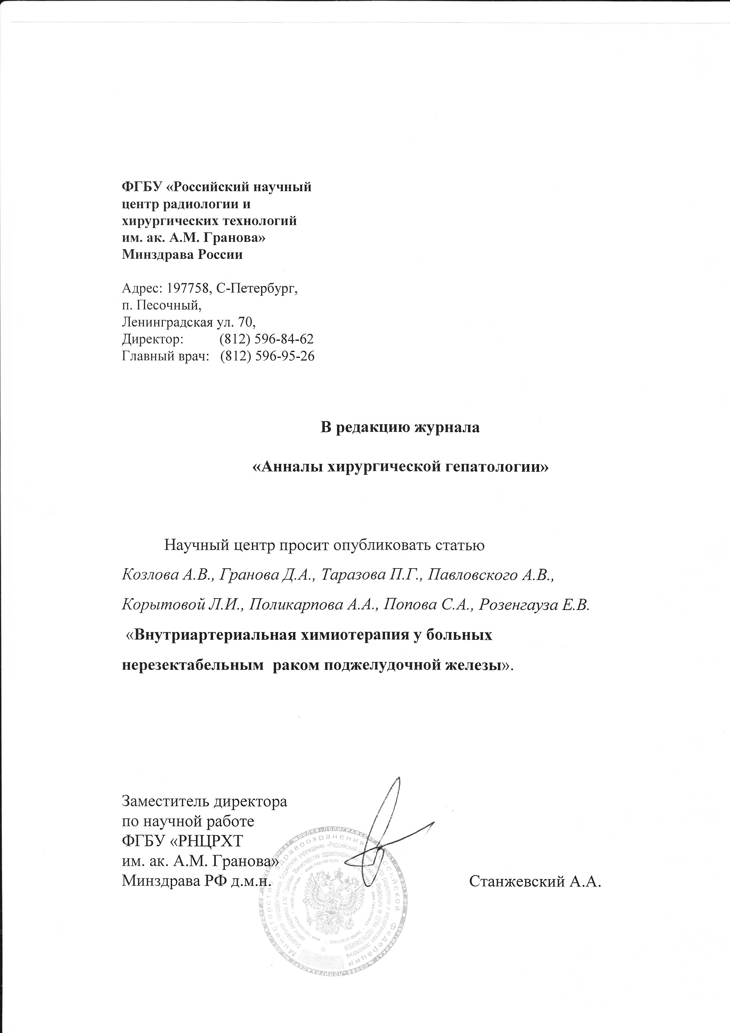 28. Поликарпов А.А., Павловский А.В., Гуло А.С., Попов С.А., Таразов П.Г., Гранов Д.А. Отдаленные результаты комбинированного рентгенэндоваскулярного и хирургического лечения пациентов с протоковой аденокарциномой поджелудочной железы. Вестник хирургии. 2013; 122 (4): 40–43.