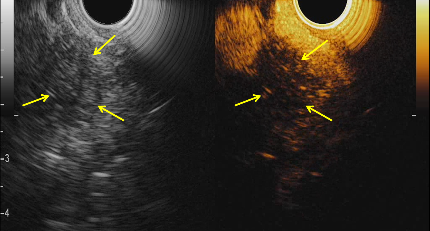 Протоковая аденокарцинома составляет 90% всех злокачественных новообразований поджелудочной железы, является четвертой по частоте причиной смертности в структуре онкологических заболеваний в Западном мире и пятой – в России. Тщательное предоперационное обследование направлено не только на постановку точного диагноза, но и на определение тактики лечения. Диагностический алгоритм подразумевает проведение эндоскопического ультразвукового исследования как уточняющего метода в сложных случаях. В статье представлены современные возможности эндо-УЗИ в сочетании с контрастированием тканей и проведением тонкоигольной биопсии, а также некоторые аспекты паллиативного эндоскопического лечения.