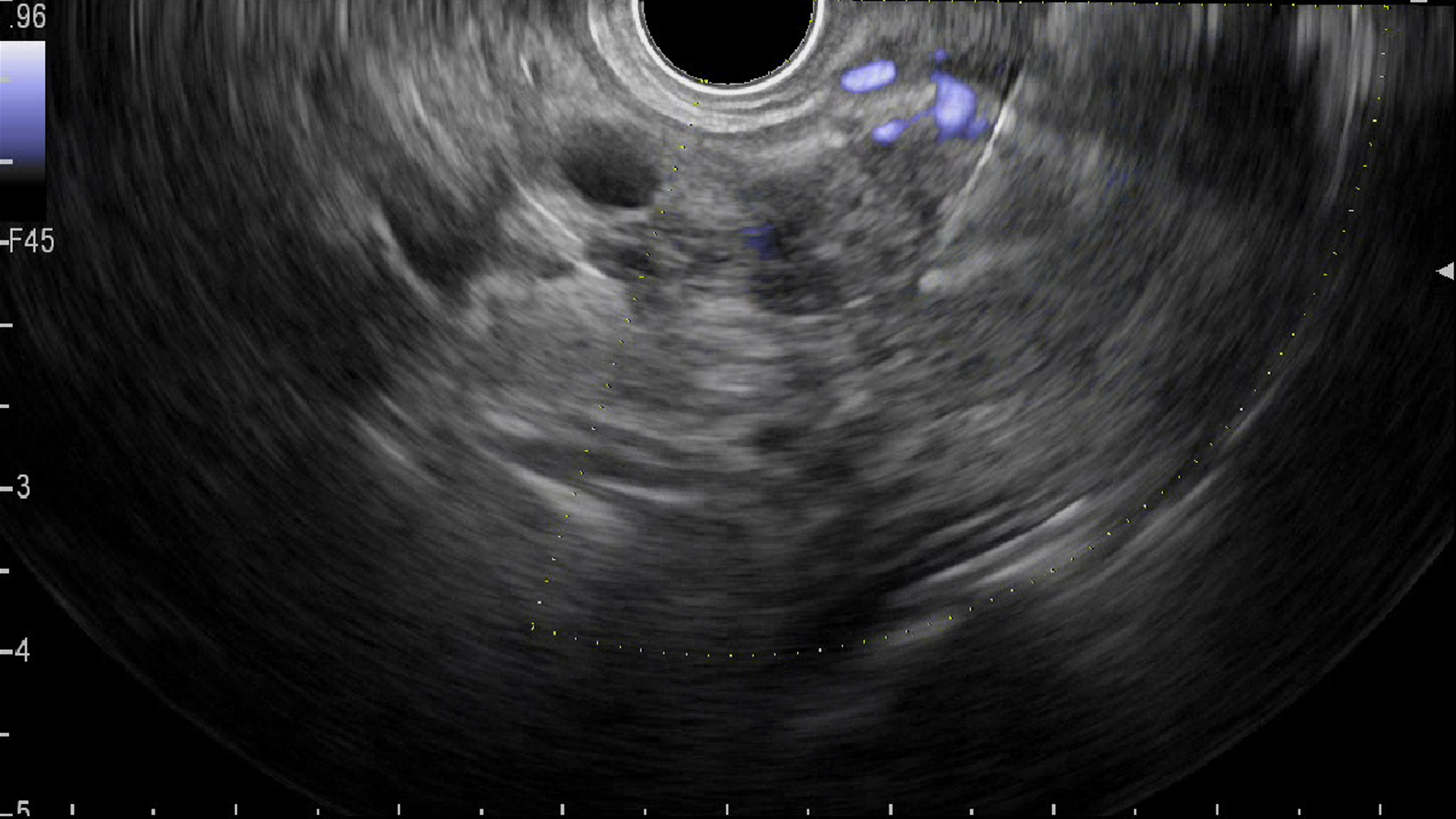 1. ЭУС - эластография новообразования поджелудочной железы: гетерогенный рисунок с преобладанием синего цвета | |