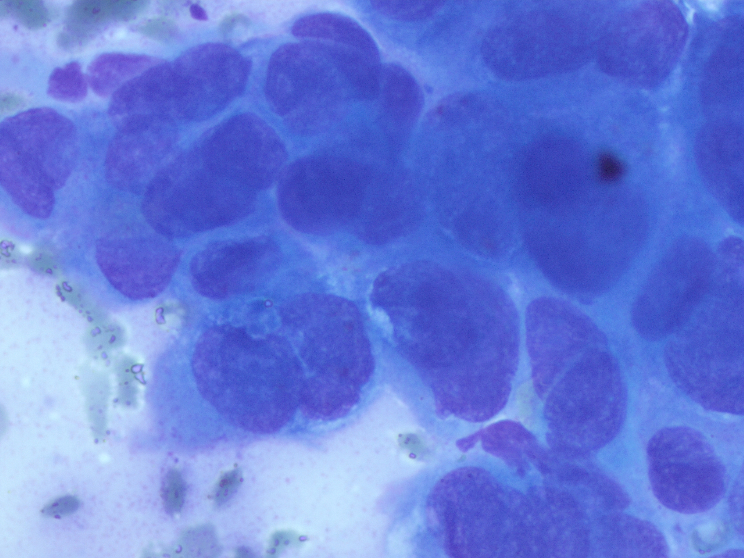 4. Пунктат опухоли ПЖ. Аденокарцинома протокового типа. Окраска по Паппенгейму (х100). | |