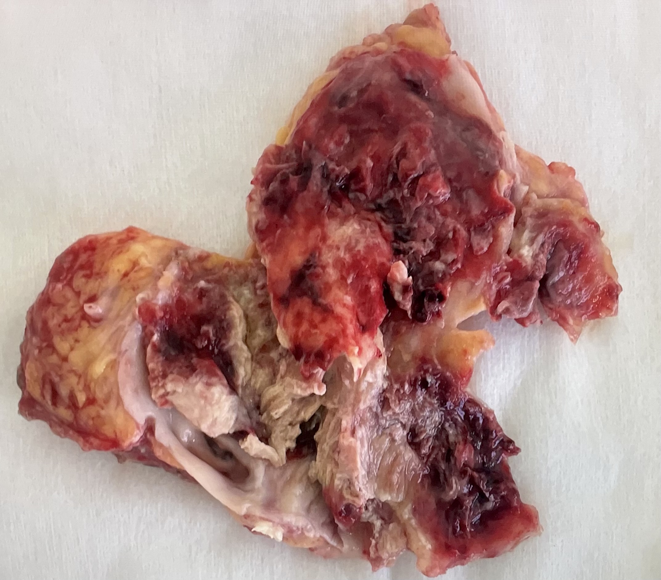 8. Макропрепарат: киста поджелудочной железы с аневризмой культи селезеночной вены, частично заполненной пристеночным тромбом. Артерио-венозная фистула.