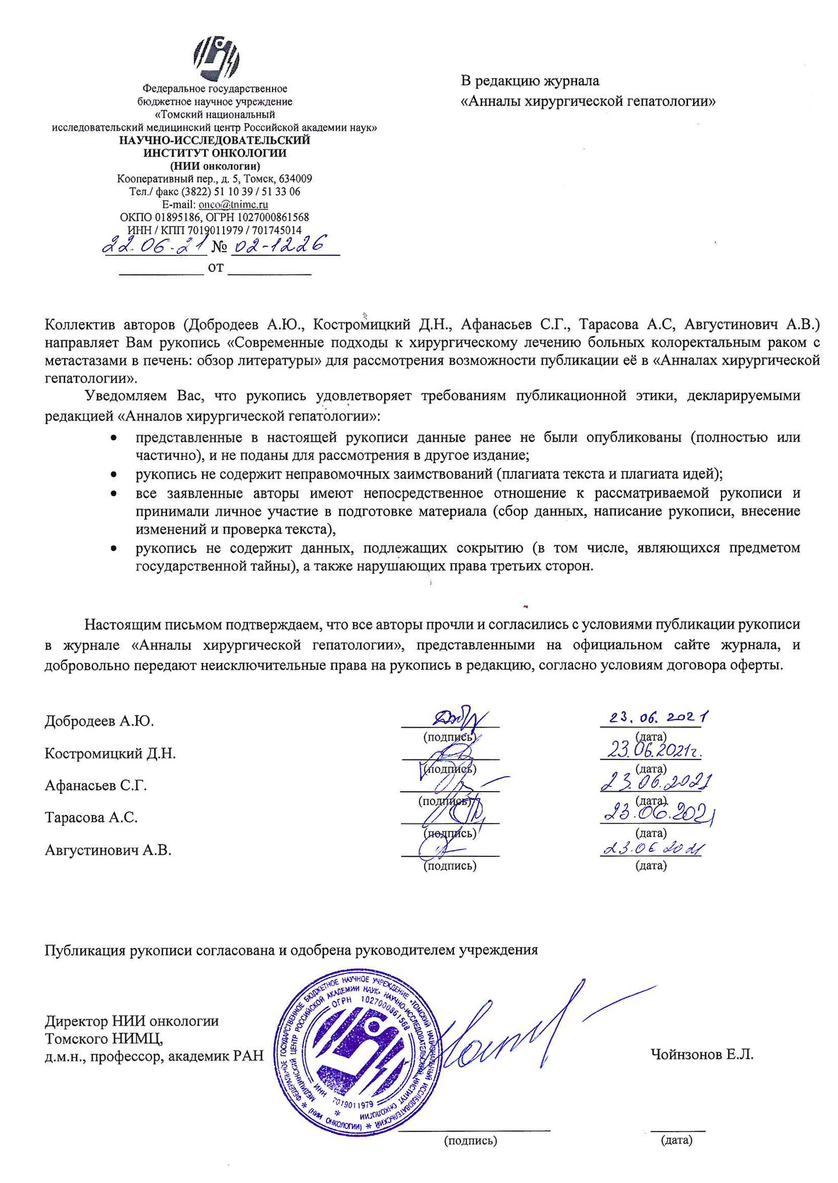 Научно-исследовательский институт онкологии, Томский национальный исследовательский медицинский центр Российской академии наук, г. Томск