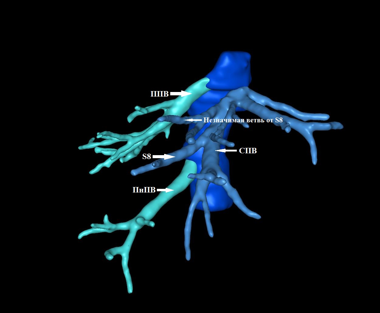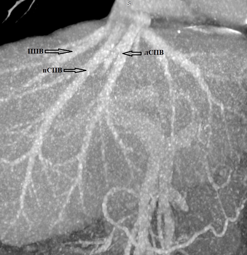 Результаты. Выявлено 14 подтипов анатомии эфферентных сосудов. Их классифицировали в 3 типа в зависимости от вклада срединной вены в отток крови от правой доли печени: кавальный (67,3%), кава-срединный (полусепаратный, 29%) и сепаратный (3,6%).