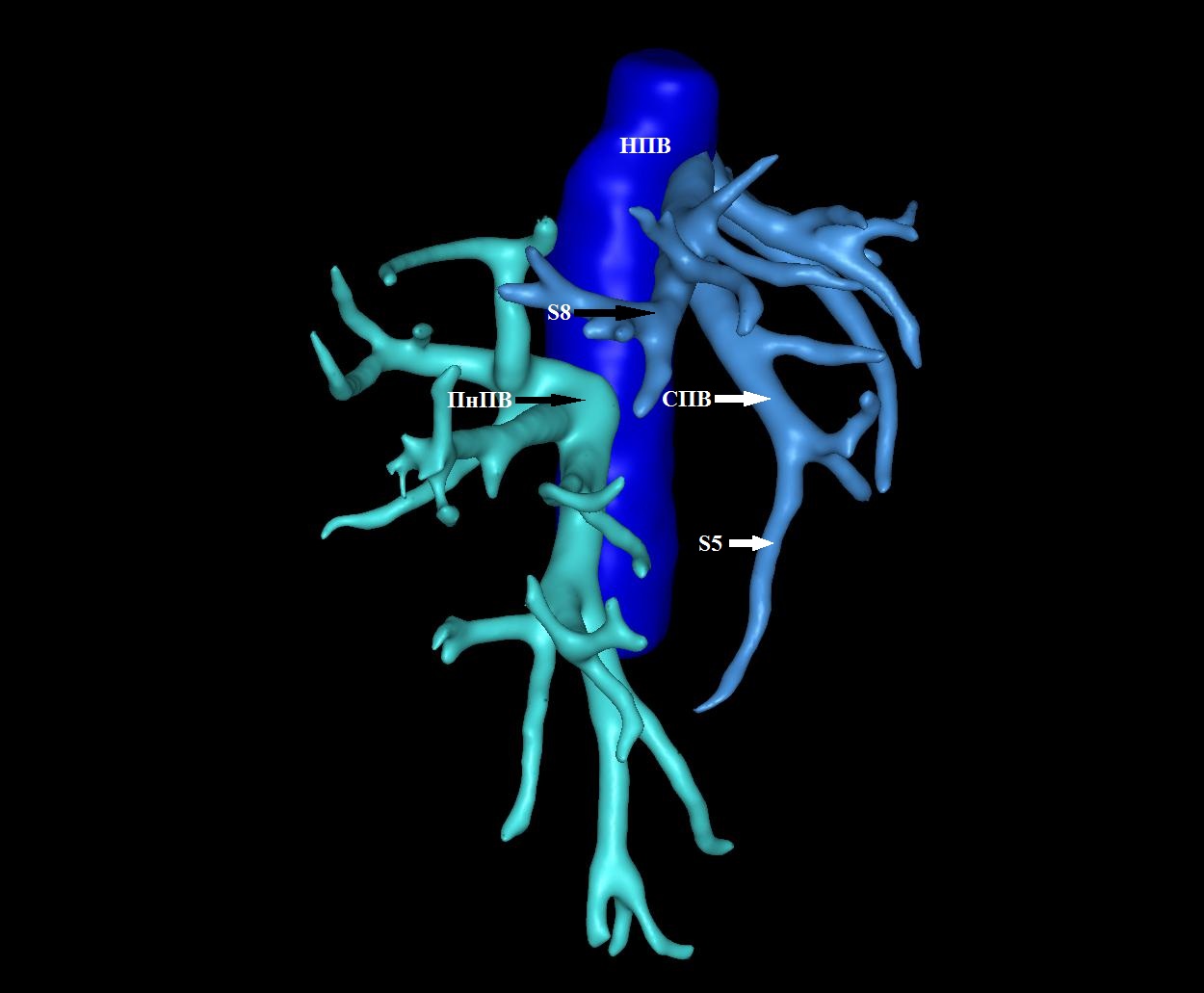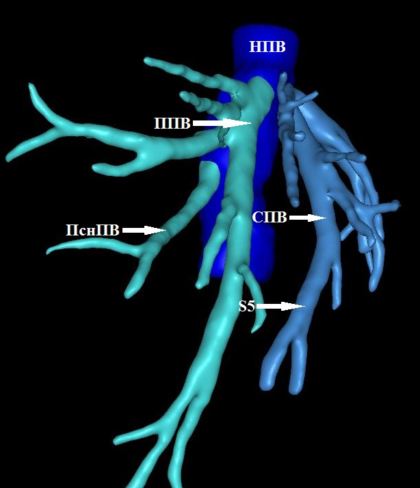 Заключение. Анатомия эфферентных сосудов трансплантата правой доли печени отличается вариабельностью и сложностью. Это требует точной оценки на дооперационном этапе при КТ для обеспечения готовности к реконструкции любой сложности.
