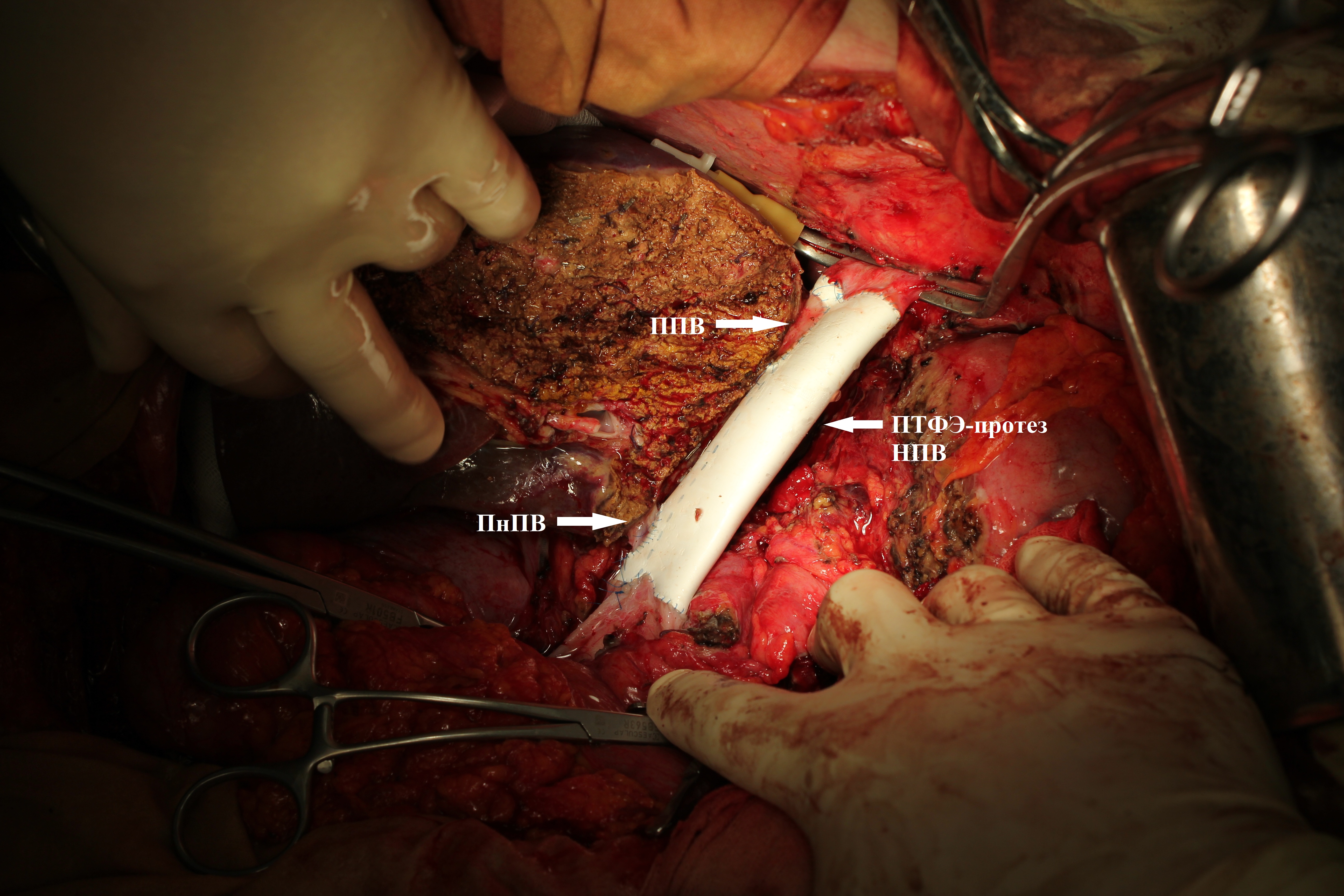 4. Рисунок 2б. Операционная фотография гепатикокавальной реконструкция при типе В строении печеночных вен трансплантата с использованием ПТФЭ-протеза НПВ